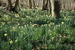Wild daffodil (Narcissus pseudonarcissus) is a particular feature of the woods in early spring. Other locally uncommon species include bitter-vetch, tutsan and lily-of-the-valley.[5]
