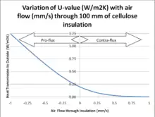 Insulations such as polyurethane (PUR) boards, which due to their micro-structure, are not air permeable are not suitable for dynamic insulation. Insulations such as rock wool, glass wool, sheep's wool, cellulose are all air permeable and so can be used in a dynamically insulated envelope. In equation (1) the air speed through the insulation, u is taken as positive when the air flow is in the opposite direction to the conductive heat flow (contra-flux). Equation (1) also applies to steady state heat flow in multi-layred walls.[2]