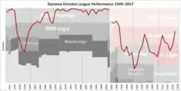 Dynamo Dresden were left with a team composed of youth and reserve players, and had dropped to the fourth tier by 1957, playing in the local Bezirksliga.[19][2] Dynamo Dresden began to climb the divisions, though,[2][20] and by 1962 they were back in the DDR-Oberliga,[20] and although this first season ended in relegation, they bounced back immediately.[20] They recovered equally well from another relegation in 1968,[20] and remained in the Oberliga from 1969 until its dissolution in 1991. This relegation came after a fourth-place finish in 1967, which enabled Dynamo's first foray into European football – they entered the 1967–68 Fairs Cup, where they were eliminated by Scottish side Rangers in the first round.[20]
