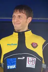 The club turned to Ruud Kaiser, a Dutchman with a good reputation at youth level, as Geyer's replacement.[53] They played in the first ever match of the third Liga, beating Rot-Weiß Erfurt 1–0 with a goal from Halil Savran,[53] but results were not consistent, and they could only finish in mid-table.[53] The 2009–10 season began badly, and Dynamo were in relegation trouble, so Kaiser was sacked and replaced by Matthias Maucksch, a former player who had had some success with the reserve team.[53] Maucksch managed to drag the team safely from relegation, and finished the season in 12th place. Maucksch led the team to contention for a playoff place during the 2010–11 season, but was sacked in April after a run of five games without a win, and was replaced by Ralf Loose.[54] Loose ended the season unbeaten and secured third place, and a playoff against VfL Osnabrück which Dynamo won 4–2 on aggregate to earn promotion to the 2. Bundesliga.[55]