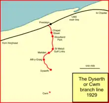 Dyserth branch line was a short standard-gauge mineral railway between the northern end of the Clwydian Range at Dyserth and the North Wales Coast Line at Prestatyn.[3] The line, which was opened by the London and North Western Railway in 1869, was built to carry quarried stone and coal. The rise of tourism led to the introduction of a passenger service in 1905. Basic halts were introduced along the line. However, competition from road transport led the passenger service being withdrawn in 1930.[4] With the eventual demise of all the mineral industries around Dyserth the entire line was closed in September 1973.