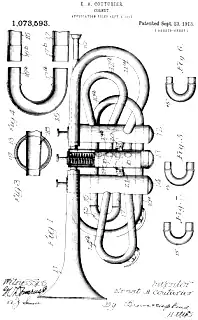 The continuous conical bore construction patented by Couturier was a core principle in his designs. E.A. Couturier company was known for the unique shape of the valve tubing, which, in its original and purest form did not support any tuning slide for fine pitch adjustment.[2] This design was to support the most continuously conical bore possible and also offered less resistance to air flow through the horn. Slides, when present, continued a conical progression by varying the wall thickness in order to achieve a movable cylindrical exterior. Those instruments built without valve slides tasked the players to bend some notes using their lips and also to rotate the horn to free the instrument of condensation during rests.[2] The Couturier cornet was typically available in a Bb/A model with a rotary valve[7] for selecting the key of the horn while other makers of the era such as H.N. White used interchangeable tuning slides.[10] Couturier and the company received numerous patents for conical bore instruments, a phonograph, the A/B-flat "quick change valve", and a mute design.[2]