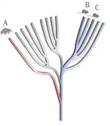 In this phylogenetic tree, species A has a higher ED score than either species B or C — it represents a branch rather than a twig on the tree of life. If species A were to go extinct, there would be no similar species left on the planet and a larger amount of unique evolutionary history would be lost forever.