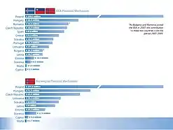 The EEA and Norway Grants made available €1.3 billion for the 2004–2009 period.[38] The EEA Grants (€672 million) supported 15 beneficiary states in Central and Southern Europe. The Norway Grants provided an additional €567 million to the ten countries that joined the EU in 2004. Apart from these two mechanisms, Norway allocated €68 million through the Norwegian bilateral cooperation programmes with Bulgaria and Romania, once the two states joined the EU in 2007.[39]