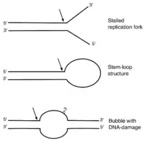 Mammalian cells carrying mutations in ERCC1 or XPF are especially sensitive to agents that cause DNA interstrand crosslinks (ICL)[25] Interstrand crosslinks block the progression of DNA replication, and structures at blocked DNA replication forks provide substrates for cleavage by ERCC1-XPF.[26][27] Incisions may be made on either side of the crosslink on one DNA strand to unhook the crosslink and initiate repair. Alternatively, a double-strand break may be made in the DNA near the ICL, and subsequent homologous recombination repair my involve ERCC1-XPF action. Although not the only nuclease involved, ERCC1–XPF is required for ICL repair during several phases of the cell cycle.[28][29]