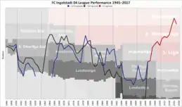 The VfB Ingolstadt-Ringsee entered the tier-two Landesliga Bayern in 1945, now independent again from the MTV.[4] In the 1946–47 season, this league was split into a northern and a southern division and this increase in numbers of clubs meant, the MTV Ingolstadt was also admitted, starting a great number of post-war derbies between those two clubs.
