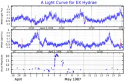 ![]() A light curve for EX Hydrae. The top two panels show the variation when the star is in its quiescent state. Red arrows mark the times of maximum eclipse. The bottom panel shows the brightness change caused by a flare. Adapted from Warner and McGraw (1981)[1] and Reinsch and Beuermann (1990).[2] | |