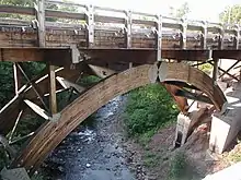 The bridge is primarily constructed of wood joined together with steel connectors. It is supported by two adjacent arches: one spans 74 feet (23 m) and the other 79 feet (24 m). Each arch is constructed from two curved sections joined together by a crown hinge. The road deck is made of wood and covered by an asphalt road surface.[2]