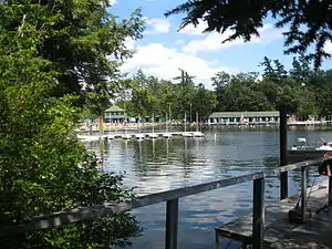 The village sits at the south end of the lake; there is a small beach at the north end. Just north of the beach is the neighborhood called Eagles Mere Park. This neighborhood developed out of a Chatauqua which lasted from 1897 to 1902. The twelve houses of the original Chatauqua are still extant and 42 similar houses were built before 1930.