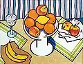 The basic subject of the painting is a woman standing behind a cluttered table of plates, fruit and books, and seen through a doorway (the painting is the shape and size of a door). There is an empty chair next to her and a guitar in between.