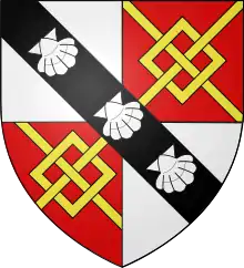 The coat of arms of the family is as follows: Quarterly argent and gules, in the second and third quarters a fret or, over all on a bend sable, three escallops of the first. The crest, emerging from the coronet, is a griffin's head argent, gorged with a bar gemelle gules between two wings expanded of the second. The supporters are: Dexter, a griffin per fess ermine and erminois, gorged with a collar sable, the edges flory-counter-flory, and chained of the last, on the collar, three escallops argent; sinister, a wyvern erect on his tail ermine, collared and chained as the griffin. The motto is Dieu defend le droit (French: God protect the right).[5]