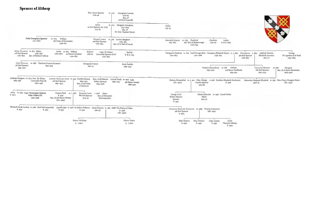 The future 6th Earl Spencer was created Viscount Althorp, of Great Brington in the County of Northampton, on 19 December 1905 in the Peerage of the United Kingdom.[4] Diana, Princess of Wales, was the youngest of three daughters of the 8th Earl Spencer. Prince William, Duke of Cambridge and Prince Harry, Duke of Sussex are grandsons of the 8th Earl Spencer.