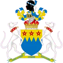 ![]() Escutcheon: Azure on a chief indented Or three mullets pierced Gules. Crest: Out of a ducal coronet a Moor’s head Proper wreathed about the temples Argent and Azure. Supporters: Two greyhounds Argent. | |