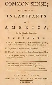 In the years just prior to the war Massachusetts played a central role as the leader in the Revolution, where Boston was considered by royal authorities as a "hot-bed of sedition".[140] During this time printers and publishers played a fundamental role in promoting the call for independence in the and uniting the American colonies in that end. Thomas Paine's 1776 work, Common Sense, outlined moral and political arguments and is considered "the most incendiary and popular pamphlet of the entire revolutionary era", and was printed by Robert Bell.[141] In response to Paine's work, James Chalmers, under the assumed name of Candidus[lower-alpha 16] countered it with a pamphlet entitled The Plain Truth, also printed by Robert Bell, which was not received well by a patriotic populace who drove Chalmers into exile.[142]
