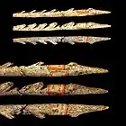 For weapons, EEMH crafted spearpoints using predominantly bone and antler, possibly because these materials were readily abundant. Compared to stone, these materials are compressive, making them fairly shatterproof.[56] These were then hafted onto a shaft to be used as javelins. It is possible that Aurignacian craftsmen further hafted bone barbs onto the spearheads, but firm evidence of such technology is recorded earliest 23,500 years ago, and does not become more common until the Mesolithic.[61] Aurignacian craftsmen produced lozenge-shaped (diamond-like) spearheads. By 30,000 years ago, spearheads were manufactured with a more rounded-off base, and by 28,000 years ago spindle-shaped heads were introduced. During the Gravettian, spearheads with a bevelled base were being produced. By the beginning of the LGM, the spear-thrower was invented in Europe, which can increase the force and accuracy of the projectile.[56] A possible boomerang made of mammoth tusk was identified in Poland (though it may have been unable to return to the thrower), and dating to 23,000 years ago, it would be the oldest known boomerang.[62] Stone spearheads with leaf- and shouldered-points become more prevalent in the Solutrean. Both large and small spearheads were produced in great quantity, and the smaller ones may have been attached to projectile darts. Archery was possibly invented in the Solutrean, though less ambiguous bow technology is first reported in the Mesolithic. Bone technology was revitalised in the Magdalanian, and long-range technology as well as harpoons become much more prevalent. Some harpoon fragments are speculated to have been leisters or tridents, and true harpoons are commonly found along seasonal salmon migration routes.[57]