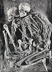 EEMH buried their dead, commonly with a variety symbolic grave goods as well as red ochre, and multiple people were often buried in the same grave.[111] However, the archaeological record has yielded few graves, less than 5 preserved per millennium, which could indicate burials were seldom given. Consequently, it is unclear if they represent isolated burials or form a much more generalised mortuary tradition.[67] Across Europe, some graves contained multiple individuals, in this case most often featuring both sexes.[111]