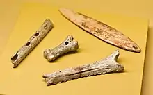 It is speculated that a few EEMH artefacts represent bullroarers or percussion instruments such as rasps, but these are harder to prove.[98] One probable bullroarer is identified at Lalinde, France, dating to 14 to 12 thousand years ago, measuring 16 cm (6.3 in) long and decorated with geometric incisions. In the mammoth-bone houses at Mezine, Ukraine, an 80 cm × 20 cm (31.5 in × 7.9 in) thigh-bone, a 53 cm × 50 cm (21 in × 20 in) jawbone, a 57 cm × 63 cm (22 in × 25 in) shoulder blade, and a 63 cm × 43 cm (25 in × 17 in) pelvis of a mammoth bear evidence of paint and repeated percussion. These were first proposed by archaeologist Sergei Bibikov to have served as drums, with either a reindeer antler or mammoth tusk fragment also found at the site being used as a drum stick, though this is contested. Other European sites have yielded potential percussion mallets made of mammoth bone or reindeer antler. It is speculated that some EEMH marked certain sections of caves with red paint which could be struck to produce a note that would resonate throughout the cave chamber, somewhat like a xylophone.[99]