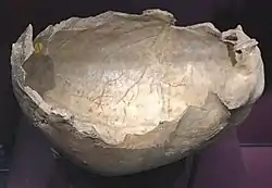 The earliest evidence of skull cups, and thus ritual cannibalism, comes from the Magdalenian of Gough's Cave, England. Further concrete evidence of such rituals does not appear until after the Palaeolithic. The Gough's Cave cup seems to have followed a similar method of scalping as those from Neolithic Europe, with incisions being made along the midline of the skull (whereas the Native American method of scalping involved a circular incision around the crown). Earlier examples of non-ritual cannibalism in Europe do not seem to have followed the same method of defleshing.[114] At least 1 skull cup was transported from a different site. In addition, Gough's Cave also yielded a human radius with a zig-zag engraving. Compared to other artefacts in the cave or common to the Magdalenian period, the radius was modified quite little, with the engraving probably quickly etched on (indicated by scrape marks not recorded on any other Magdalenian engraving), and the bone broken and discarded soon thereafter. This may indicate the bone's only function was as a tool in some cannibalistic and/or funerary ritual, rather than being prepared to be carried around by the group as an ornament or tool.[115]