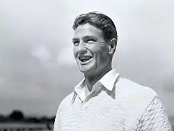 Miller went to the local state school before transferring to Melbourne High School—a selective government institution that accepted students through an academic exam—at the start of 1934.[17] The school's emphasis on scholastic and sporting excellence and its culture was more in line with that of a private school than a standard government school.[18] Australian Test captain Bill Woodfull was on the teaching staff as Miller's mathematics teacher.[2] Because he did little study and focused his energy on sport, Miller was a mediocre student.[18] In addition to cricket and football, Miller played baseball and competed in swimming. This disappointed Woodfull, a disciplined man who invoked the school's motto Honour the Work in exhorting his students to work hard as Australia was attempting to emerge from the depths of the Great Depression.[18] Despite being Australia's captain, Woodfull refused to involve himself in the coaching of the school's cricket teams, feeling that it would intrude on the responsibilities of the sports teachers.[2] Despite this, Woodfull watched the students at cricket training and quickly noticed Miller's skills.[19] Aged 14 and still under 153 cm (5 ft 0 in), Miller was selected in the school's First XI. With his pads flapping against his stomach and sporting a sawn-down bat, Miller batted at No. 6 and scored 44 on his senior debut. Although his lack of power was obvious, Miller's control and solidity prompted the spectators to call him the Unbowlable, the same nickname that was accorded to Woodfull, who had a similarly strong defensive style. Melbourne went on to win the match,[20] and Miller impressed his captain Keith Truscott, who fought for his selection and took him under his wing.[20] Truscott later became an ace fighter pilot in the Royal Australian Air Force,[14] and Miller would follow in his footsteps. Truscott's social influence compounded the distractions from Miller's study. Miller failed all eight of his subjects at the end of 1934, and with an average mark of 25%, was the class dunce. He scored zero in his final exam for Woodfull's geometry class,[21] and was forced to repeat year 9.[22]