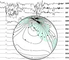 Globe: map showing locations of observatories and contour lines giving horizontal magnetic intensity in μ T.