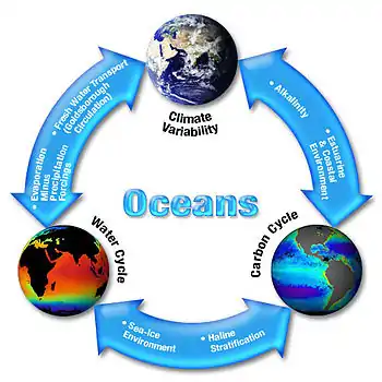 Earth system science (ESS) is the application of systems science to the Earth.[1][2][3][4] In particular, it considers interactions and 'feedbacks', through material and energy fluxes, between the Earth's sub-systems' cycles, processes and "spheres"—atmosphere, hydrosphere, cryosphere,[5] geosphere, pedosphere, lithosphere, biosphere,[6] and even the magnetosphere[7]—as well as the impact of human societies on these components.[8] At its broadest scale, Earth system science brings together researchers across both the natural and social sciences, from fields including ecology, economics, geography, geology, glaciology, meteorology, oceanography, climatology, paleontology, sociology, and space science.[9] Like the broader subject of systems science, Earth system science assumes a holistic view of the dynamic interaction between the Earth's spheres and their many constituent subsystems fluxes and processes, the resulting spatial organization and time evolution of these systems, and their variability, stability and instability.[10][11][12] Subsets of Earth System science include systems geology[13][14] and systems ecology,[15] and many aspects of Earth System science are fundamental to the subjects of physical geography[16][17] and climate science.[18]