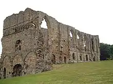 Easby Abbey, which is in ruins, was one of many dissolved by Henry VIII as part of the reformation. The important Anglo-Saxon stone Easby Cross of 800-820 is currently in the Victoria and Albert Museum in London, but the church, from whose walls three of the four fragments were recovered in 1931, displays a plaster cast. The ruins are a Grade I listed building[11] as is the Abbey Gatehouse.[12]