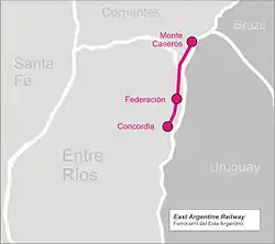 Starting from Concordia, Federación was reached in 1874, Monte Caseros the next year and then Ceibo on the River Uruguay, which was later developed as a port. Financial problems ensued and further construction of the line was stopped.