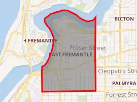 East Fremantle is bounded by the Swan River to the north and west, East Street to the southwest, Marmion Street to the south and Petra Street to the east.[4]