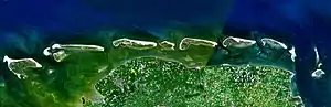 The East Frisian Islands (German: Ostfriesische Inseln, West Frisian: Eastfryske eilannen, Saterland Frisian: Aastefräiske Ailounds) are a chain of islands in the North Sea, off the coast of East Frisia in Lower Saxony, Germany. The islands extend for some 90 kilometres (56 mi) from west to east between the mouths of the Ems and Jade / Weser rivers and lie about 3.5 to 10 km offshore. Between the islands and the mainland are extensive mudflats, known locally as Watten, which form part of the Wadden Sea. In front of the islands are Germany's territorial waters, which occupy a much larger area than the islands themselves. The islands, the surrounding mudflats and the territorial waters (The Küstenmeer vor den ostfriesischen Inseln nature reserve) form a close ecological relationship. The island group makes up about 5% of the Lower Saxony Wadden Sea National Park.