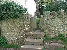 The scanty ruins of Richmont Castle are about 1⁄4-mile (400 m) southeast of the village church. The castle was besieged in 1138 when King Stephen captured it from Sir William de Harptree, a supporter of Queen Matilda's cause in the civil war between the king and queen. The castle was also visited by King John in 1205.[12] The castle was demolished by its owner, Sir John Newton, in the reign of Henry VIII to build a house nearby called Eastwood.[13]