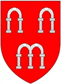 Another branch of the Arches family, bearing the same canting armorials of Gules, three arches argent,[6] had been established in Buckinghamshire since at the latest 1309,[3] and held the manors of Little Kimble, and in the parish of Waddesdon the manors of Eythrope[7] and Cranwell.[3] Richard Arches (d.1417) of Eythrope, was MP for Buckinghamshire in 1402. His eventual heir was John Dinham, 1st Baron Dinham (1433–1501), the son of his daughter and heiress Joan Arches.[8]