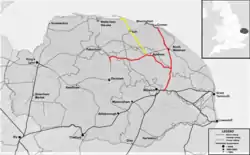 The 1864 Act included plans for a line to Aylsham, diverging south of Wroxham station. In 1876 this plan was revived, and modified, to leave the main line north of Wroxham station.[6] The branch line diverged on a tight 10 chain curve at Wroxham Junction.[7] A large granary was provided at Aylsham, stables were provided at Coltishall for the malt trade and a local man paid for a large shed at Buxton.[8] The Great Eastern Railway had taken control of the East Norfolk Railway in 1881, before this line was completed.[9] The branch joined the Great Eastern Railway's line from Dereham to Fakenham at Broom Green, where there was a 20 chain curve.[7] The complete line opened in 1882.[10]