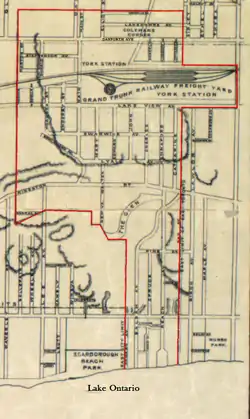 The area, after being colonized by British settlers, was occupied in about 1850, when it was a considerable distance from the city of Toronto. It was incorporated as a village in 1888 when there were about 800 people living in the area. The area began to grow rapidly and in 1903 it was elevated from a village to a town. The southern part of the community by the lake became one of Toronto's most popular travel destinations, and became home to hotels and amusement parks. The northern section, by contrast, was an industrial centre, home to the Grand Trunk Railway's main yards.[1] These facilities stretched along most of Gerrard Street, and employed several hundred workers.