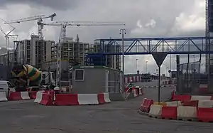 Up until this point, the proposed site had been a mix of former industrial buildings and contaminated waste land. The proposed site for the village provided two living camp sites for Irish Travellers, one on Clays Lane, Newham, and a second on Waterden Crescent, Hackney. The final part of the Olympic CPO covering the village site, secured in December 2006, was unsuccessfully challenged by the travellers in the High Court in May 2007.[8] Towards the end of demolition/site clearance, on 12 November 2007 a fire broke out in an old industrial warehouse on Waterden Road, Hackney Wick, on the western edge of the proposed Olympic village site. With flames of 50 feet (15 m) in height engulfing the building and sending clouds of acrid black smoke over the city centre, it took 75 firefighters from the London Fire Brigade to bring the fire under control.[9]