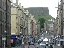 Most of the area comprises tenement housing built for the artisan and working classes in the second half of the 19th century on mainly nursery ground feued on the south-eastern side by Baron Norton's Estate, (formerly belonging to the Logans of Restalrig), on the south-western side by the George Heriot's Trust and further north, on both sides of the road, Trinity Hospital.[4] These tenements remain almost wholly intact, except at the northern, Leith end of the road where streets between Thorntree Street and Leith Central railway station were subject to slum clearance in the 1970s and replaced with new housing. The station has since been demolished and replaced by a supermarket and a leisure centre. New housing has also appeared since the 1970s in several locations on and just off Easter Road, for example opposite Thorntree Street, in Albion Road and in Brunswick Road. About a third of the road at the southern, London Road, end is the older retail area, comprising residential tenements with, at ground-floor level, small shops typical of a high street. There are a few corner shops and public houses on the northern two-thirds of the road particularly at the junction with Lorne Street. The southward view along the road focuses upon Salisbury Crags. Easter Road was the last major road in Scotland to be paved with granite setts replacing tarmac in 1955. After a fatality on the road in the late 1990s the road was re-tarmacked, saving the costly expense of maintaining the setts.