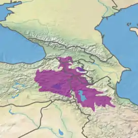 The ecoregion occupies the Armenian Highlands, a plateau lying mostly between 1500 to 2500 meters elevation. The volcanic peaks Mount Ararat (5137 m) and Mount Süphan (4058 m) rise above the plateau.[1] It covers portions of eastern Turkey, eastern and southern Armenia, Azerbaijan's Nakhchivan Autonomous Republic, the Javakheti region of southern Georgia, and northwestern Iran. The highlands are bounded on the northeast by the Lesser Caucasus, on the northwest by the Pontic Mountains, and on the south by the Zagros Mountains. To the east the plateau descends towards the Aras-Kura lowlands, and in the Aras valley the ecoregion descends to 375 meters elevation.