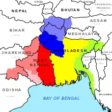 A map of Bengal (and some districts of Assam and Jharkhand) which shows the dialects of the Bengali Language according to Suniti Kumar Chatterji.