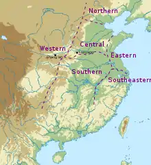 Several texts contain evidence of dialectal variation in the Eastern Han period. The Fangyan, from the start of the period, discusses variations in regional vocabulary. By analysing the text, Paul Serruys identified six dialect areas: a central area centred on the Central Plain east of Hangu Pass, surrounded by northern, eastern, southern and western areas, and a southeastern area to the south and east of the lower Yangtze.[15][16][17] Distinct rhyme systems of the Han period poets identified by Luo and Zhou broadly correspond to these dialect areas.[18]