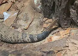 The color pattern consists of a brownish, brownish-yellow, brownish-gray or olive ground color, overlaid with a series of 24–35 dark brown to black diamonds with slightly lighter centers. Each of these diamond-shaped blotches is outlined with a row of cream or yellowish scales. Posteriorly, the diamond shapes become more like crossbands and are followed by 5–10 bands around the tail. The belly is a yellowish or cream-colored, with diffused, dark mottling along the sides. The head has a dark postocular stripe that extends from behind the eye backwards and downwards to the lip; the back of the stripe touches the angle of the mouth. Anteriorly and posteriorly, the postocular stripe is bordered by distinct white or yellow stripes.[13] The rattle at the end of their tail is made of hard, loosely attached, hollow segments which break of frequently and are completely replaced when the snake sheds.[23]