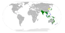 The eastern great egret has a wide distribution throughout Asia and Oceania, with breeding populations in Australia, Bangladesh, China, Nepal, India, Indochina, Indonesia, Japan, Korea, Myanmar, New Zealand, Pakistan, Papua New Guinea, Philippines (Zamboanga), Russia (north-eastern), Solomon Islands, Sri Lanka, Thailand and Taiwan.[9] The egret breeds across Australia but only rarely in the southwest of the continent or dry interior.[10] The largest colonies within Australia are in the Top End and Channel Country, which can number several thousand pairs. Colonies in the southeast of Australia can number several hundred pairs.[8] The bird is an uncommon autumn and winter visitor to Tasmania.[11]