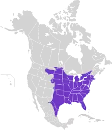 Eastern screech owls inhabit open mixed woodlands, deciduous forests, parklands, wooded suburban areas, riparian woods along streams and wetlands (especially in drier areas), mature orchards, and woodlands near marshes, meadows, and fields. They try to avoid areas known to have regular activity of larger owls, especially great horned owls (Bubo virginianus). Their ability to live in heavily developed areas outranks even the great horned and certainly the barred owl (Strix varia); screech owls also are considerably more successful in the face of urbanization than barn owls (Tyto alba) following the conversion of what was once farmland.[4] Due to the introduction of open woodland and cultivated strips in the Great Plains, the range of eastern screech owls there has expanded.[4] Eastern screech owls have been reported living and nesting in spots such as along the border of a busy highway and on the top of a street light in the middle of a busy town square. They often nest in trees in neighborhoods and urban yards inhabited by humans. In such urban environments, they often meet their dietary needs via introduced species that live close to man such as house sparrows (Passer domesticus) and house mice (Mus musculus).[4] They also consume anole lizards and large insects such as cicadas. They occupy the greatest range of habitats of any owl east of the Rockies. Eastern screech owls roost mainly in natural cavities in large trees, including cavities open to the sky during dry weather. In suburban and rural areas, they may roost in manmade locations such as behind loose boards on buildings, in boxcars, or on water tanks. They also roost in dense foliage of trees, usually on a branch next to the trunk, or in dense, scrubby brush. The distribution of the species is largely concurrent with the distribution of eastern deciduous woodlands, probably discontinuing at the Rocky Mountains in the west and in northern Mexico in the south due to the occupation of similar niches by other screech owls and discontinuing at the start of true boreal forest because of the occupation of a similar niche by other small owls (especially boreal owls (Aegolius funereus). Eastern screech owls may be found from sea level up to 1,400 m (4,600 ft) in elevation in the eastern Rocky Mountains and up to 1,500 m (4,900 ft) in the eastern Sierra Madre Oriental Mountains, although their altitudinal limits in the Appalachian Mountains, near the heart of their distribution, is not currently known.[4][8]