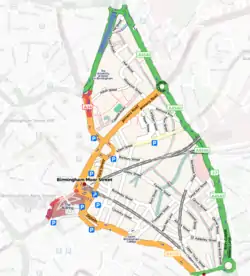 The majority of the development is centred on Curzon Street railway station and along Curzon Street which gives its name to two developments to the rear of the station which began with the demolition of a Parcelforce Depot.[4] This will be called Curzon Park and will feature a major low to mid-rise mixed-use scheme with residential, leisure and hotel facilities. An outline planning application was submitted by the developers on 27 July 2007.[5]