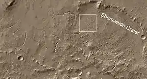 Eberswalde, formerly known as Holden NE, is a partially buried impact crater in Margaritifer Terra, Mars. Eberswalde crater lies just to the north of Holden, a large crater that may have been a lake. The 65.3-km-diameter crater, centered at 24°S, 33°W, is named after the German town of the same name, in accordance with the International Astronomical Union's rules for planetary nomenclature.[1] It was one of the final four proposed landing sites for the Mars rover Mars Science Laboratory mission.[2][3] This extraterrestrial geological feature lies situated within the Margaritifer Sinus quadrangle (MC-19) region of Mars. Although not chosen, it was considered a potential landing site for the Mars 2020 Perseverance rover, and in the second Mars 2020 Landing Site Workshop it survived the cut and was among the top eight sites still in the running.[4]