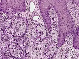 Eccrine carcinoma is a rare skin condition characterized by a plaque or nodule on the scalp, trunk, or extremities.[1]: 669 It originates from the eccrine sweat glands of the skin, accounting for less than 0.01% of diagnosed cutaneous malignancies.[2] Eccrine carcinoma tumors are locally aggressive, with a high rate of recurrence. Lack of reliable immunohistochemical markers and similarity to other common tumors has made identification of eccrine carcinoma difficult.[2]