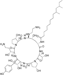 Echinocandins are a class of antifungal drugs[1] that inhibit the synthesis of β-glucan in the fungal cell wall via noncompetitive inhibition of the enzyme 1,3-β glucan synthase.[2][3] The class has been termed the "penicillin of antifungals,"[4] along with the related papulacandins, as their mechanism of action resembles that of penicillin in bacteria. β-glucans are carbohydrate polymers that are cross-linked with other fungal cell wall components, the fungal equivalent to bacterial peptidoglycan. Caspofungin, micafungin, and anidulafungin are semisynthetic echinocandin derivatives with limited clinical use due to their solubility, antifungal spectrum, and pharmacokinetic properties.[5]