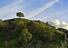 The lowest-elevation biotic zone in the Sierra Nevada is found along the boundary with the Central Valley.[5] This zone, stretching in elevation from 500 to 3,500 feet (150 to 1,070 m), is the foothill woodland zone, an area that is hot and dry in the summer with very little or no snow in the winter.[5] The foothills are vegetated with grasslands of mostly non-native grasses, mixed grasslands and woodlands savanna, a foothill woodland community of blue oak and gray pine, and chaparral. Many of the plant communities are similar to those found on the inner California Coast Ranges.[6] Animals typical of this zone include black bear, ringtail cat, coyote, gray squirrel, bobcat, California mule deer, and skunk.[4] In the foothills of the northern portion of the Sierra Nevada, toyon and chamise often co-dominate certain open serpentine chaparral communities.[7]