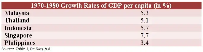The GDP of the Philippines rose during the martial law, rising from $8.0 billion to $32.5 billion in about 8 years. This growth was spurred by massive lending from commercial banks, accounting for about 62% percent of external debt.[1] As a developing country, the Philippines during the martial law was one of the heaviest borrowers. These aggressive moves were seen by critics as a means of legitimizing martial law by purportedly enhancing the chances of the country in the global market. Much of the money was spent on pump-priming to improve infrastructure and promote tourism. However, despite the aggressive borrowing and spending policies, the Philippines lagged behind its Southeast Asia counterparts in GDP growth rate per capita. The country, in 1970–1980, only registered an average 3.4 percent growth, while its counterparts like Thailand, Malaysia, Singapore, and Indonesia garnered a mean growth of 5.4 percent.[1] This lag, which became very apparent at the end of the Marcos Regime, can be attributed to the failures of economic management that was brought upon by State-run monopolies, mismanaged exchange rates, imprudent monetary policy and debt management, all underpinned by rampant corruption and cronyism. “[…]main characteristics distinguishing the Marcos years from other periods of our history has been the trend towards the concentration of power in the hands of the government, and the use of governmental functions to dispense economic privileges to some small factions in the private sector".[1]