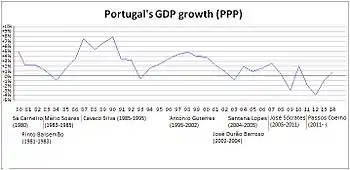 The Portuguese economy has been steady, expanding continuously since the third quarter of 2014, with a yearly GDP growth of 1.5% registered in the second quarter of 2015.[33] The economy's growth has been accompanied by a continuous fall in the unemployment rate (6.3% in the first quarter of 2019, compared with 13.9% registered in the end of 2014). The government budget deficit has also been reduced from 11.2% of GDP in 2010 to 0.5% in 2018. These rates mark an inversion from the negative trends caused by the impact of the financial crisis of 2007–2008 in the Portuguese economy that made it to shrink for three consecutive years (2011, 2012, and 2013), accompanied by a high increase of the unemployment rate (that achieved a record of 17.7% in early 2013).[34] The crisis has caused a wide range of domestic problems that are specifically related to the levels of public deficit, as well as the excessive debt levels, in the economy. The problems culminated in the confirmation from Portugal to a €78 billion financial bailout from the EU in April 2011, following similar decisions from Greece and the Republic of Ireland. The government that assumed office in June 2011 had to face tough choices in regard to its attempts to stimulate the economy while at the same time seeking to maintain its public deficit around the EU average.[35]