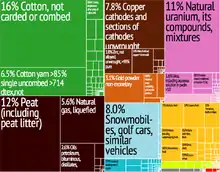 Exports - commodities:[17] cotton 17.2%, energy products 13.1%, metals 12.9%, machinery and equipment 10.1%, food products 7.9%, chemical products 5.6%, services 12.1%( 2006)