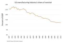 The worst recession in recent decades, in terms of lost output, occurred during the financial crisis of 2007–08, when GDP fell by 5.0% from the spring of 2008 to the spring of 2009. Other significant recessions took place in 1957–58, when GDP fell 3.7%, following the 1973 oil crisis, with a 3.1% fall from late 1973 to early 1975, and in the 1981–82 recession, when GDP dropped by 2.9%.[92][93] Recent, mild recessions have included the 1990–91 downturn, when output fell by 1.3%, and the 2001 recession, in which GDP slid by 0.3%; the 2001 downturn lasted just eight months.[93] The most vigorous, sustained periods of growth, on the other hand, took place from early 1961 to mid-1969, with an expansion of 53% (5.1% a year), from mid-1991 to late in 2000, at 43% (3.8% a year), and from late 1982 to mid-1990, at 37% (4% a year).[92]